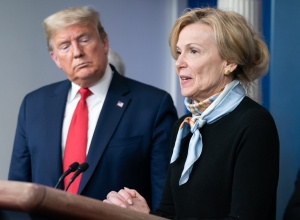 Dr Deborah Birx, the US administration's Covid-19 co-ordinator, sits stony faced as her boss adds disinfectant injections and the insertion of ultraviolet probes onto her research Must-Do list during a press briefing last week.